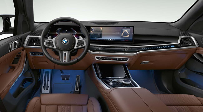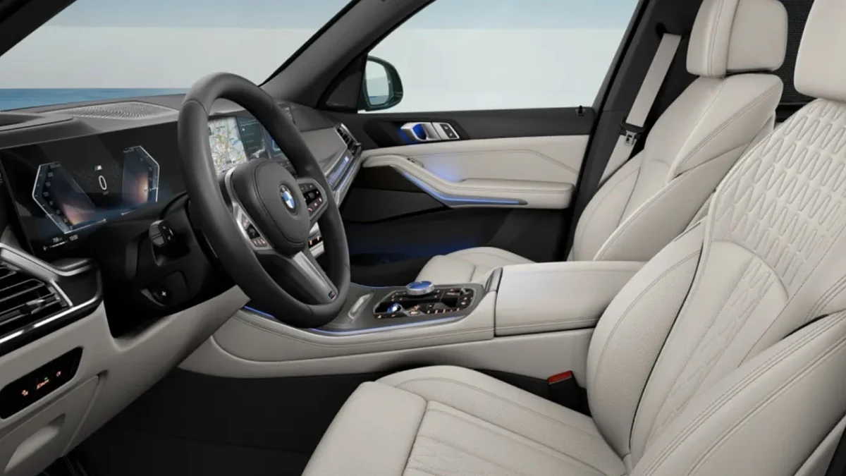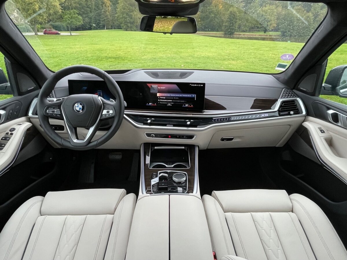 Le tableau de bord est partiellement recouvert d’un nouveau panneau en verre intégrant le tableau de bord numérique et un écran d’infodivertissement central d’environ 15 pouces. Ce dernier utilise le logiciel iDrive 8 de BMW et un système de commande vocale avancé. La charge sans fil est standardisée, mais la troisième rangée de sièges en option semble avoir été supprimée, bien que cela n’ait pas été définitivement confirmé par BMW.