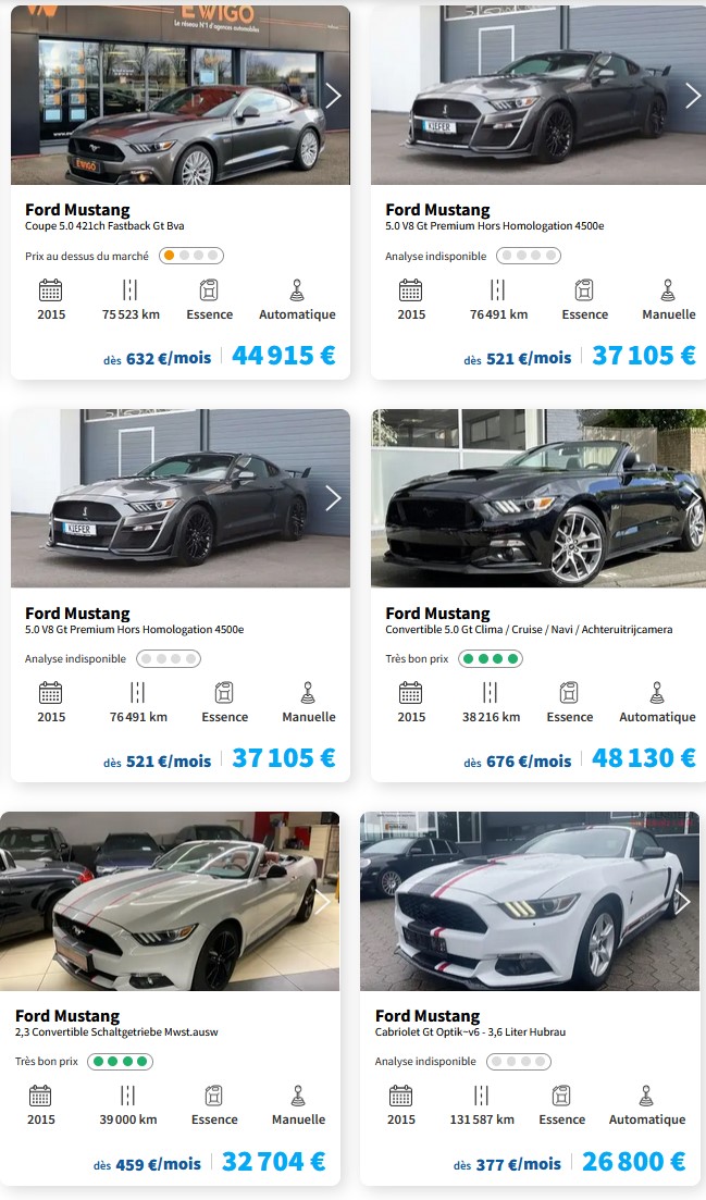 Pour ceux intéressés par l’achat d’une Ford Mustang 2015 en occasion, le marché français offre de nombreuses opportunités. Les prix pour une Mustang d’occasion varient en fonction de l’état, du kilométrage, et des spécifications exactes, mais restent généralement attractifs, rendant cette voiture premium accessible à un public plus large. De plus, le stock de Mustangs d’occasion en France est assez diversifié, permettant aux acheteurs de trouver la configuration précise qu’ils désirent, que ce soit en boîte manuelle ou auto.