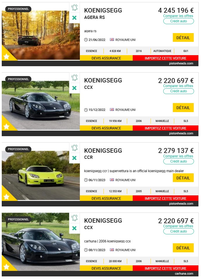 - Koenigsegg CCX : Lors de sa sortie, le CCX était vendu autour de 1 million de dollars. Comme il n’est plus produit, les modèles disponibles sur le marché secondaire peuvent varier grandement en prix, souvent augmentant en fonction de leur rareté et de leur condition.