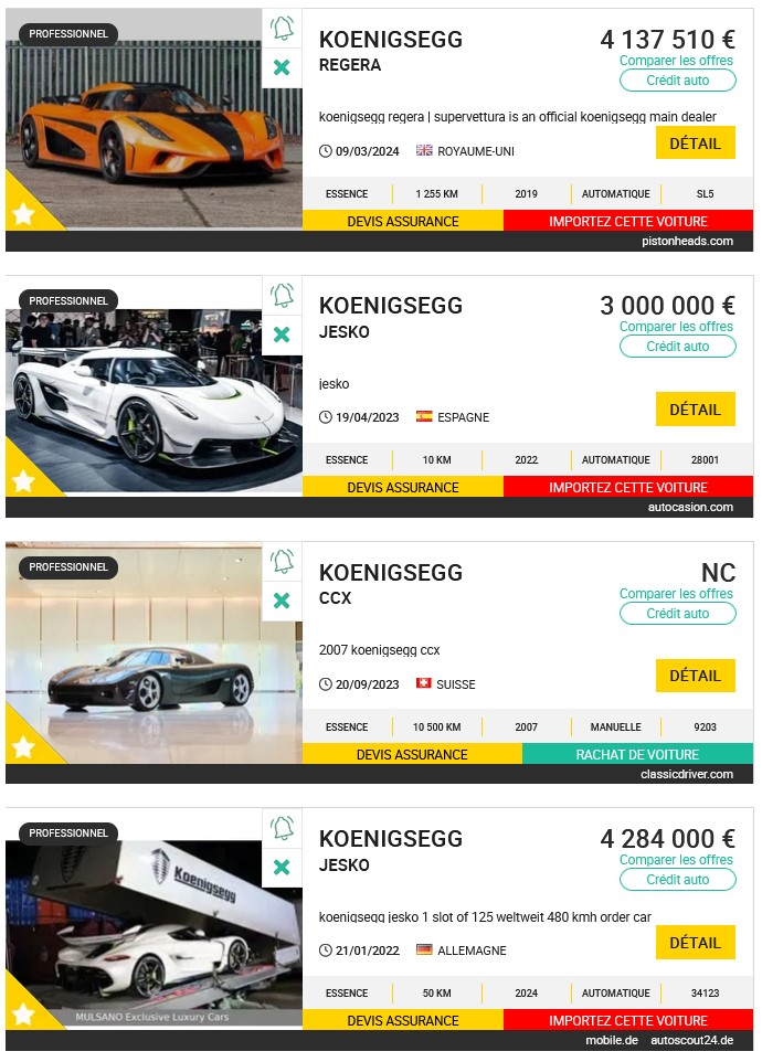 Les prix peuvent varier considérablement en fonction de la personnalisation, de l’exclusivité du modèle, et de l’évolution du marché des véhicules de collection. De plus, les voitures Koenigsegg étant souvent produites en quantités très limitées, leur disponibilité et leur prix sur le marché secondaire peuvent être substantiellement plus élevés que ceux des modèles neufs.