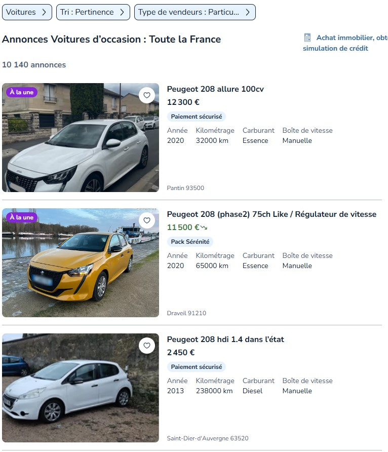 Avant tout – si vous cherchez à acheter une voiture a un particulier, pensez a activer l’option type de vendeur et choisissez particulier, afin de faire des économies, car en passant par un professionnel, le tarif sera augmenté a cause de la marge du vendeur pro qui peut prendre entre 3000 € jusqu’à 10 000 € de marge selon la marque et le modèle, du véhicule, voici ci dessous une capture écran des bon prix que vous pouvez trouvez actuellement pour une voiture en bon état directement entre particuliers :